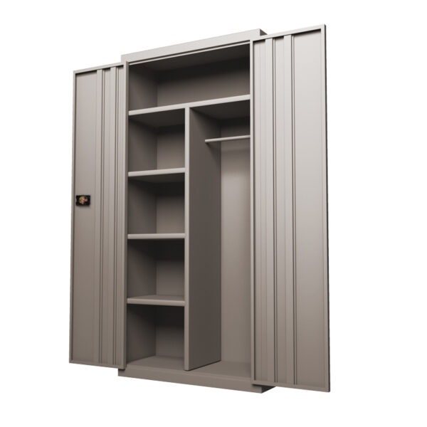 Cuenta con un entrepaño fijo, medios entrepaños fijos y un espacio con una barra para colgar.