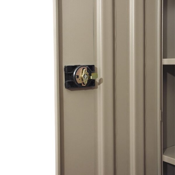 El cuerpo y las puertas son ensamblados mediante soldadura por resistencia. Cuenta con entrepaños fijos reforzados para mayor resistencia en cada división. Dos puertas abatibles, las puertas de los gabinetes se abren y cierran por medio de tres bisagras, cada puerta cuenta con 2 refuerzos verticales. Una puerta lleva su cerradura empotrada fabricada en plásticos ABS tipo paleta, incluye dos llaves y su estiradera.